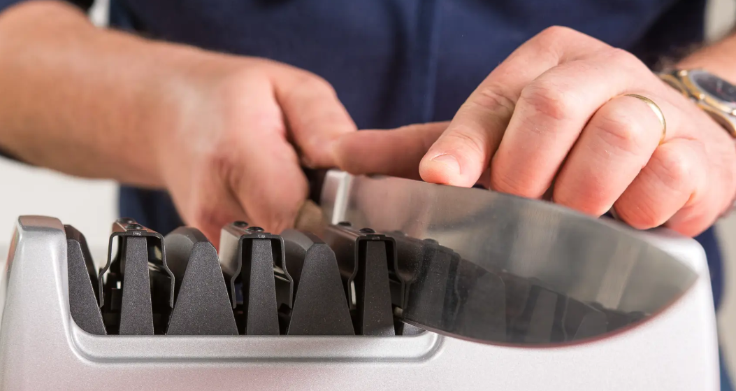 A lot of electric sharpeners have little guides that help keep your knife at the right angle. Just let the arrows point the way and give you instructions.